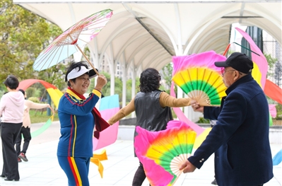 置身其間,市民或舞動彩綢,或跳扇子舞,或打乒乓球,幸福的笑容洋溢在臉上,這里已成為周邊居民健身娛樂的打卡地。