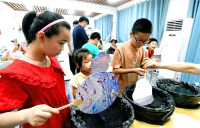 7月19日,赤壁市趙李橋鎮(zhèn)綜合文化服務(wù)站,武漢工程大學(xué)聽濤社會(huì)實(shí)踐團(tuán)大學(xué)生志愿者帶著孩子們制作非遺漆扇。