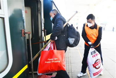 29日,咸寧火車站,鐵路青年志愿者幫行李較多的老年旅客提行李上車。咸寧日報(bào)全媒體記者陳紅菊攝。