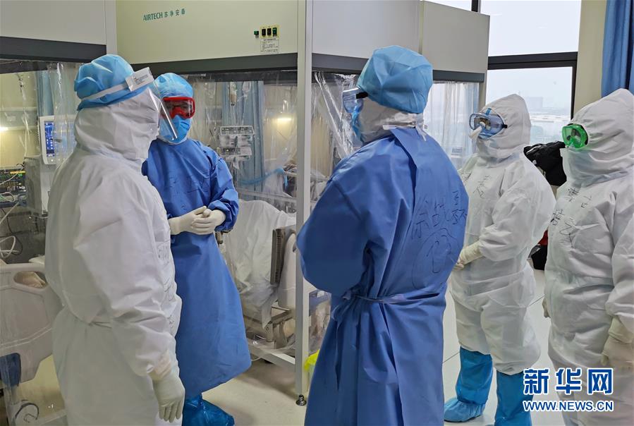2月21日,張正良(左二)在武漢協(xié)和醫(yī)院西院病房內與同事探討患者治療方案(手機照片)。新華社發(fā)
