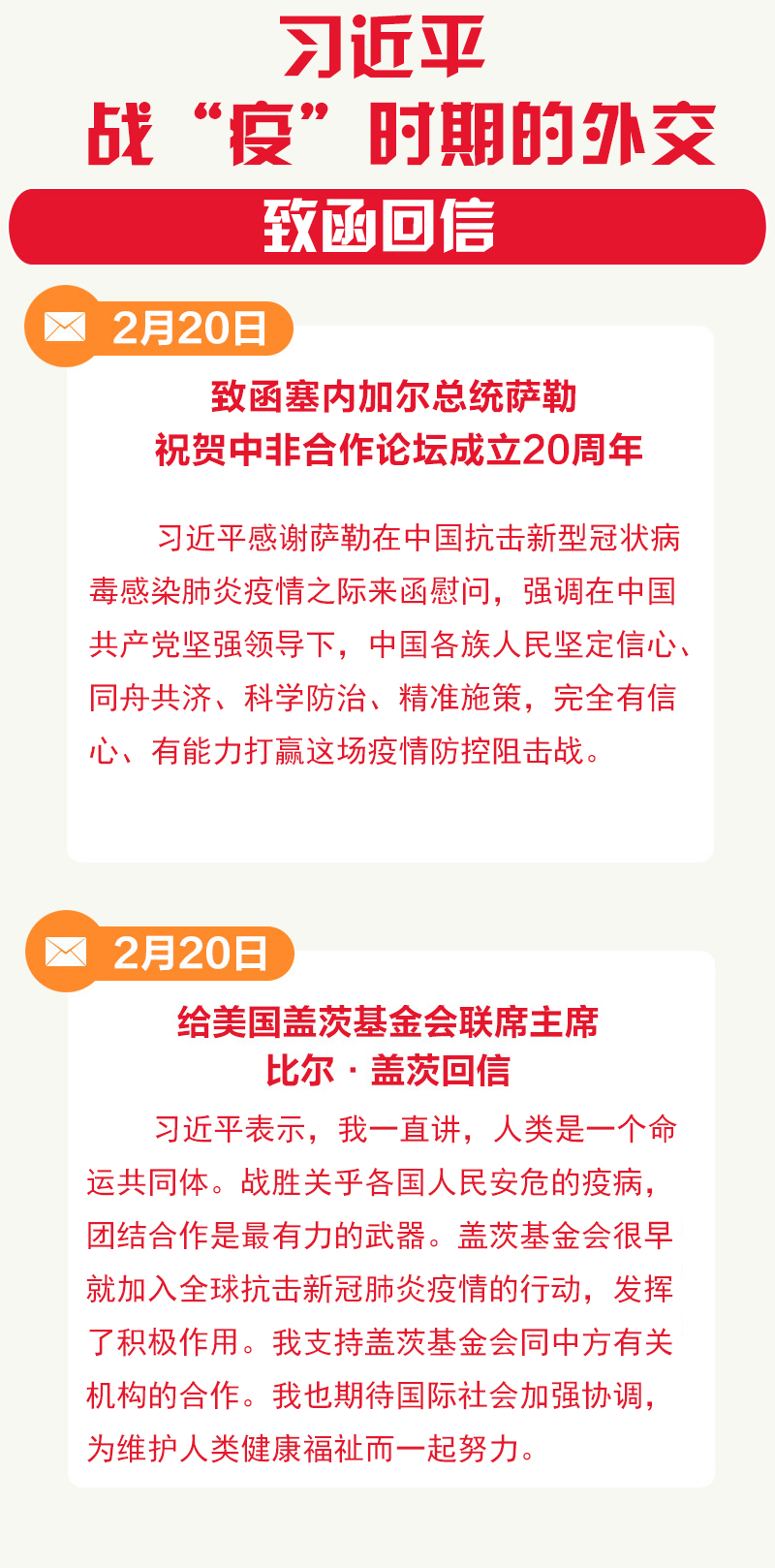 2月,習近平致函中非合作論壇非方共同主席國塞內加爾總統(tǒng)薩勒,祝賀中非合作論壇成立20周年,并感謝他在中國抗擊新冠肺炎疫情之際來函慰問,強調在中國共產黨堅強領導下,中國各族人民堅定信心、同舟共濟、科學防治、精準施策,完全有信心、有能力打贏這場疫情防控阻擊戰(zhàn)。習近平給美國蓋茨基金會聯(lián)席主席比爾·蓋茨回信,感謝他和蓋茨基金會對中國防控新冠肺炎疫情工作的支持,呼吁國際社會加強協(xié)調、共同抗擊疫情。