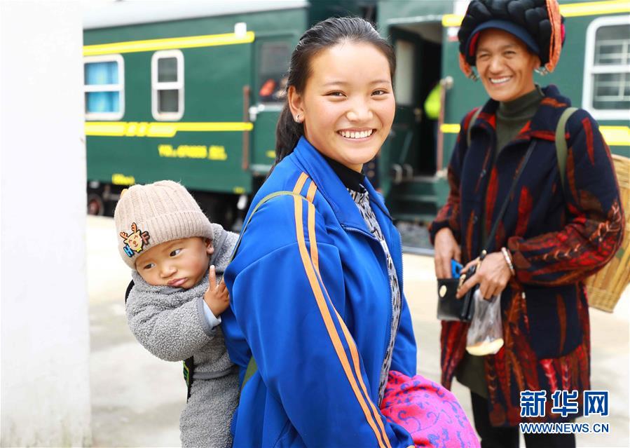 9月28日,5633次“小慢車”抵達(dá)月華站,彝族旅客背著孩子出站。 ?新華社發(fā)(李鍇 攝)