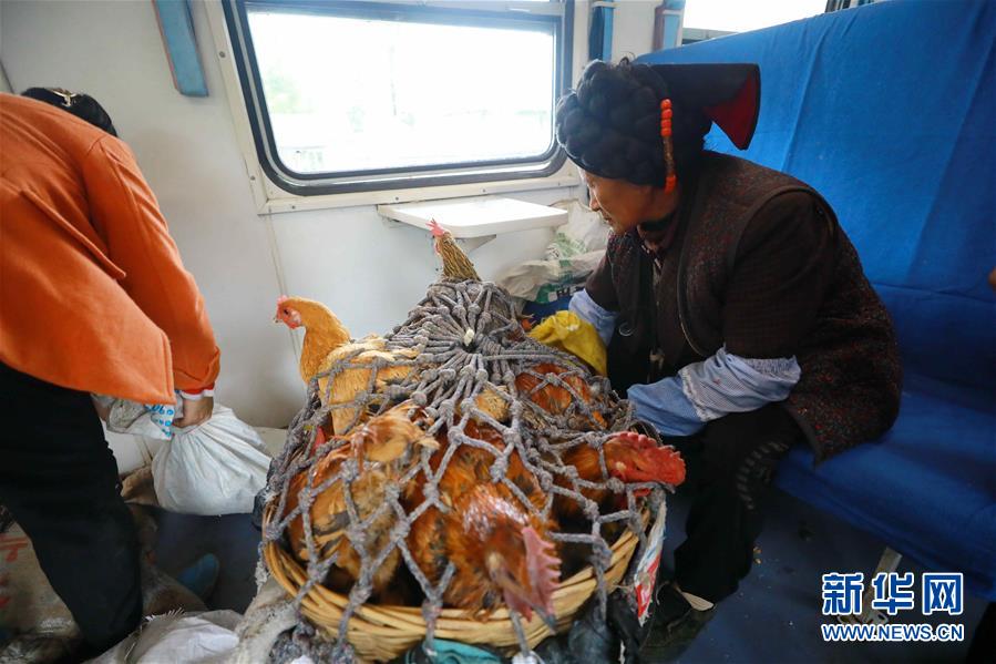 9月28日,在普雄開往攀枝花的5633次列車上,彝族老鄉(xiāng)乘坐“小慢車”帶著土雞前往縣城交易。 ?新華社發(fā)(李鍇 攝)