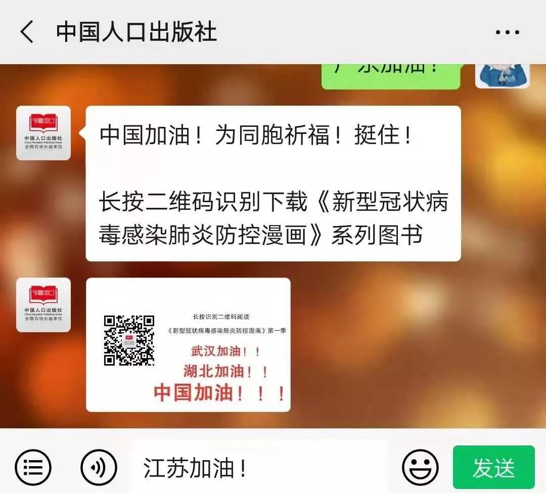 關注“中國人口出版社”公眾號,在對話框中輸入您的所在省市地區(qū),如 “湖北省加油!”、“北京加油!”,即可免費接收《新型冠狀病毒感染肺炎防控漫畫》全系列電子書!