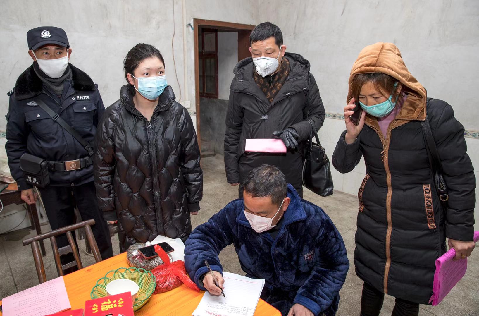 1月26年,大年初二,通山縣林業(yè)局取消春節(jié)休假,組織多個專班到興林小區(qū)、老林業(yè)局職工宿舍小區(qū)、林場帶村,入戶排查登記武漢返鄉(xiāng)人員,并發(fā)放武漢返鄉(xiāng)人員健康須知。圖為該局國有林場管理局干部職工到林場帶村高湖村武漢返鄉(xiāng)人員家中入戶登記。