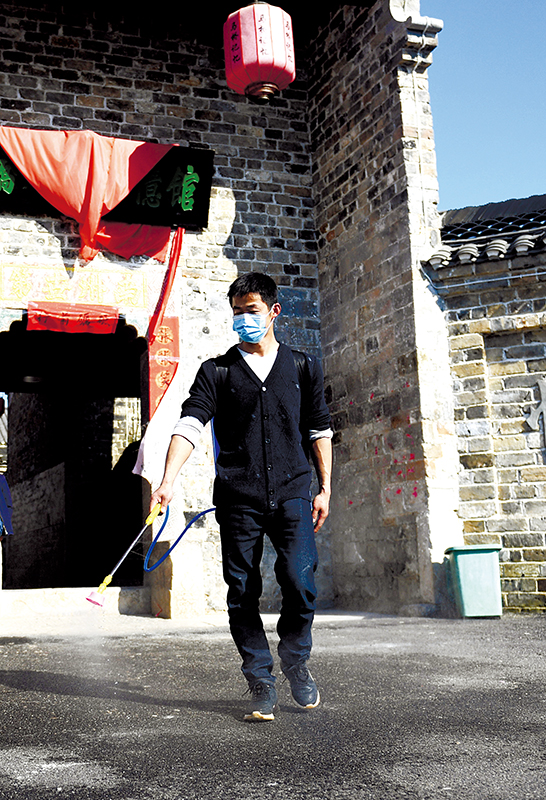 防疫人員對農(nóng)家進(jìn)行噴藥消毒