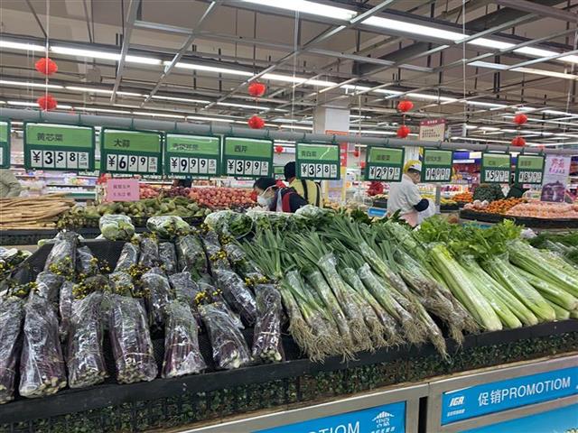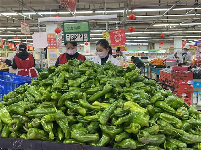 在超市一樓,記者看到,大米、食用油、蔬菜、水果、肉類、蛋奶、調(diào)料等供應(yīng)充足,貨架上大量鋪貨。價(jià)格也十分平穩(wěn),物價(jià)水平和節(jié)前沒有明顯差別。