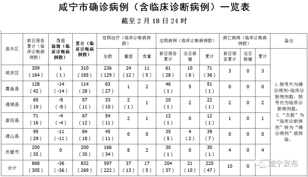 2020年2月18日0時(shí)-24時(shí),咸寧市核減新型冠狀病毒肺炎病例36例,其中咸安區(qū)新增1例(臨床診斷病例1例),嘉魚縣核減14例,通城縣核減8例,崇陽(yáng)縣核減4例,通山縣核減11例,赤壁市新增0例。全市新增治愈出院21例(含臨床診斷病例10例),其中:咸安10例,嘉魚5例,通山4例,通城2例。無(wú)新增病亡病例。
