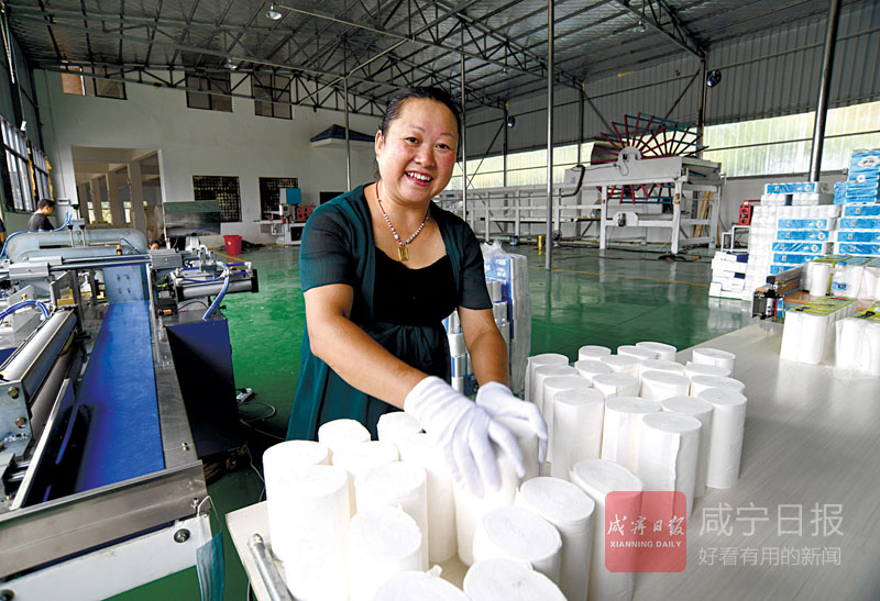 11日,崇陽(yáng)縣石城鎮(zhèn)大寨興苑集中安置點(diǎn)旁望輝紙業(yè)就業(yè)扶貧車(chē)間,易地搬遷戶周海霞將卷紙整理裝袋。周海霞一個(gè)人帶著孩子生活,目前在大寨興苑擁有一套50平米的房子,在扶貧車(chē)間上班每月固定收入1800元,對(duì)此她感到很滿足。