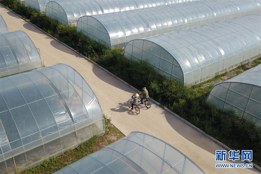 9月2日,在定西市安定區(qū)魯家溝鎮(zhèn)南川村,邵俊堂(右)和妻子騎自行車前往高標(biāo)準(zhǔn)日光溫室大棚(無人機(jī)照片)。新華社記者 范培珅 攝