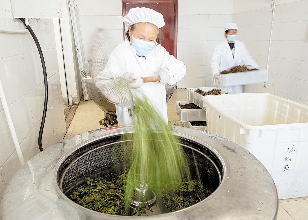 梅家河鄉(xiāng)三掌坪村五組建檔立卡貧困戶譚德翠在香椿加工車間工作。
