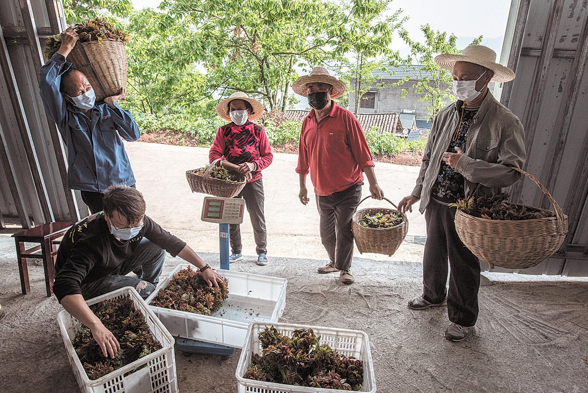 農(nóng)戶們將種植的香椿芽拿到合作社等待收購。