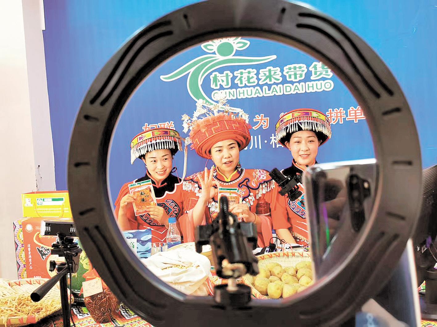 像這樣的“村花直播”,這條網(wǎng)紅街已有40多名土家族“幺妹”參與,銷(xiāo)售的多是豆干、洋芋醬、小土豆和臘肉等農(nóng)產(chǎn)品。