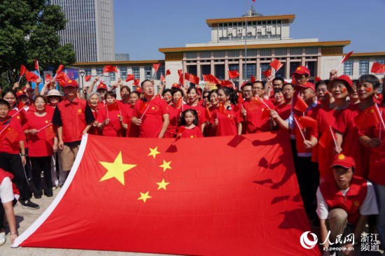 人民網(wǎng)杭州10月1日電 (張麗瑋)今天上午10時許,一場迎國慶紅韻快閃活動在杭州市武林廣場舉行。伴隨著《我和我的祖國》《歌唱祖國》的悠揚曲調(diào),人們心潮澎湃,紛紛舉起手中的小紅旗,百余人一起唱響歌曲,獻禮祖國。