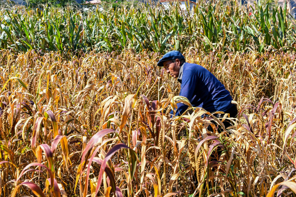 山西省左權(quán)縣麻田村的脫貧戶在收割谷子。(新華社記者 曹陽2020年10月16日攝)