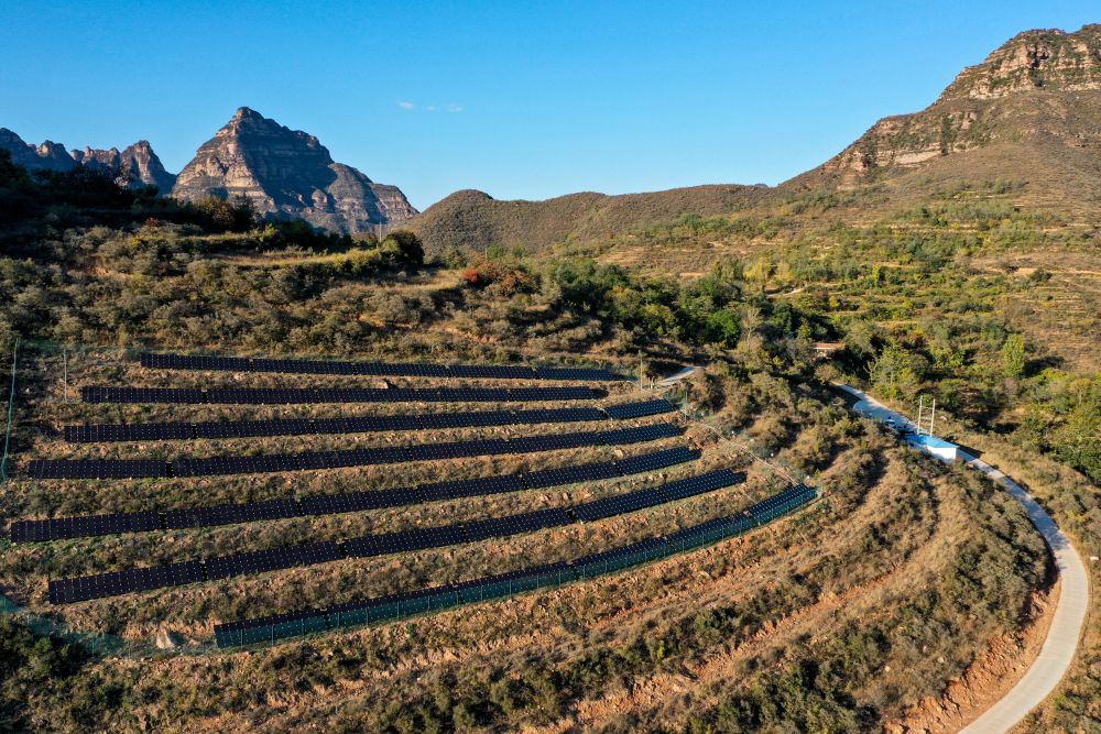 山西省左權(quán)縣麻田村的村級光伏電站。(無人機(jī)照片,新華社記者 曹陽2020年10月16日攝)