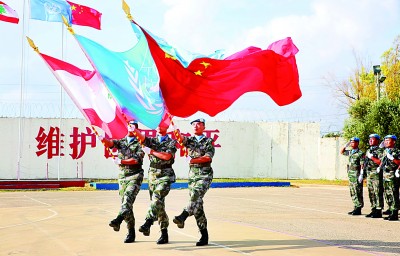 這是二○一六年五月二十三日,在黎巴嫩南部辛尼亞村,中國赴黎巴嫩維和部隊(duì)士兵舉著中國國旗、聯(lián)合國旗幟和黎巴嫩國旗參加中國第十五批與第十四批赴黎巴嫩維和部隊(duì)的輪換交接儀式。新華社發(fā)????