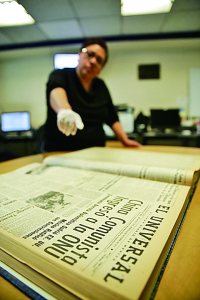 2019年9月9日,墨西哥《宇宙報》閱覽室員工介紹當(dāng)年中國重返聯(lián)合國的相關(guān)報道。新華社發(fā)