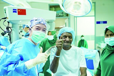 在馬爾代夫首都馬累附近的胡魯馬累醫(yī)院,當(dāng)?shù)匾幻先顺晒邮苁中g(shù)后,豎起大拇指感謝中國眼科醫(yī)療隊。新華社發(fā)