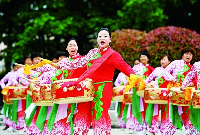 文化志愿者在商丘市夏邑縣栗城廣場表演盤鼓。苗育才攝/光明圖片