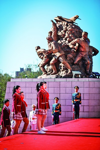 在向遼寧丹東抗美援朝紀(jì)念塔敬獻(xiàn)花籃儀式上,學(xué)生代表瞻仰紀(jì)念塔。新華社發(fā)