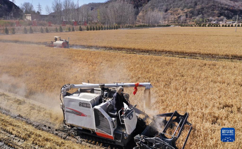 收割機(jī)在延安市南泥灣鎮(zhèn)收割水稻(2020年10月23日攝,無人機(jī)照片)。新華社記者 陶明 攝