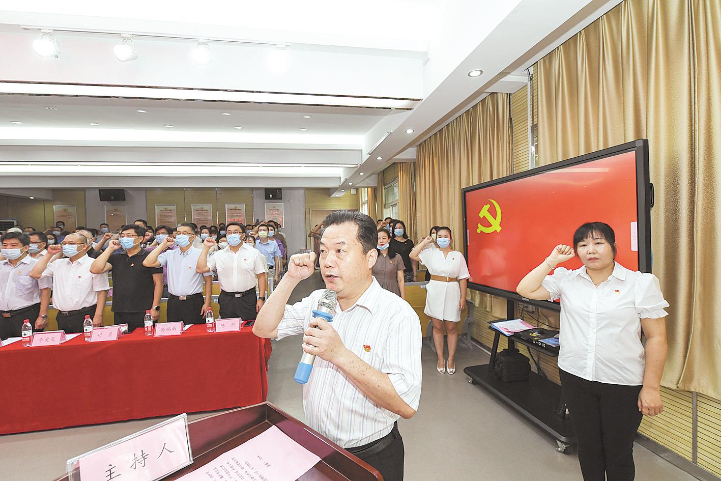 2020年8月2日,武漢市武昌區(qū)凱樂(lè)花園小區(qū)綜合黨委成立,來(lái)自省市區(qū)各級(jí)機(jī)關(guān)企事業(yè)單位的80多名下沉黨員和小區(qū)黨員重溫入黨誓詞。 ? ?2020年6月起,我省全面推行機(jī)關(guān)企事業(yè)單位黨組織和黨員干部“雙報(bào)到”制度,壯大了社區(qū)治理力量,形成小區(qū)治理合力。(湖北日?qǐng)?bào)全媒記者 陳勇 攝)