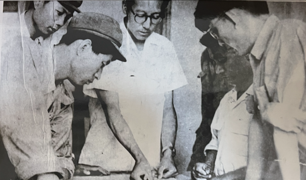 年輕時(shí)的劉志祥(左二)和同事討論。(采訪對(duì)象供圖)