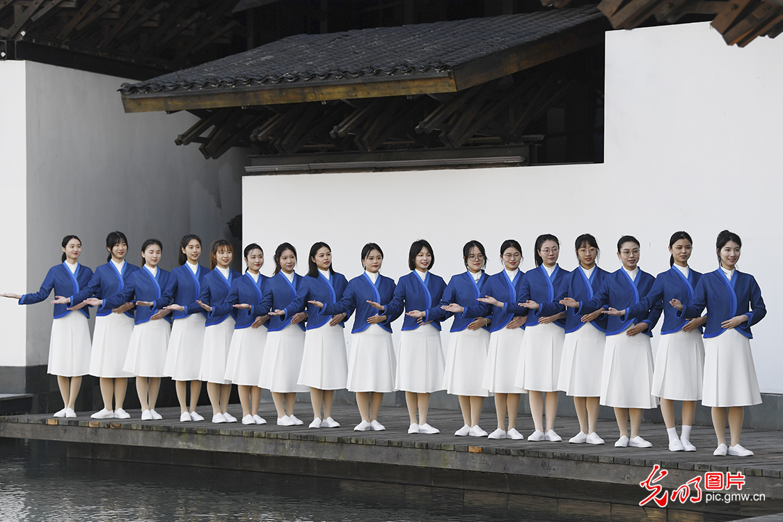 2022年11月6日,烏鎮(zhèn)互聯(lián)網(wǎng)國(guó)際會(huì)展中心,“小梧桐”志愿者拍攝合影。(光明網(wǎng)記者 潘迪攝/光明圖片)