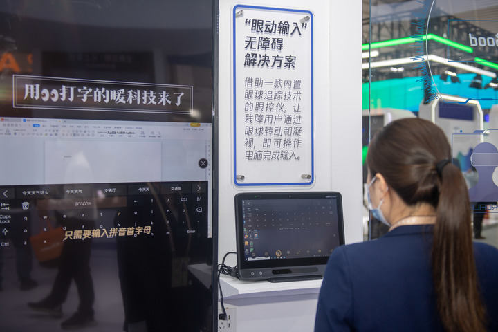 在騰訊公司展區(qū),一款可以用眼睛打字的眼動(dòng)輸入儀吸引了人們的關(guān)注。儀器能夠精準(zhǔn)捕捉用戶的眼球滾動(dòng),從而實(shí)現(xiàn)打字功能。展會(huì)工作人員介紹,對(duì)于殘障人士、“漸凍癥”患者等人群來說,通過眼球轉(zhuǎn)動(dòng)和凝視即可操作電腦完成輸入,眼動(dòng)輸入儀幫助他們提升了打字效率,使他們的生活更加便利。