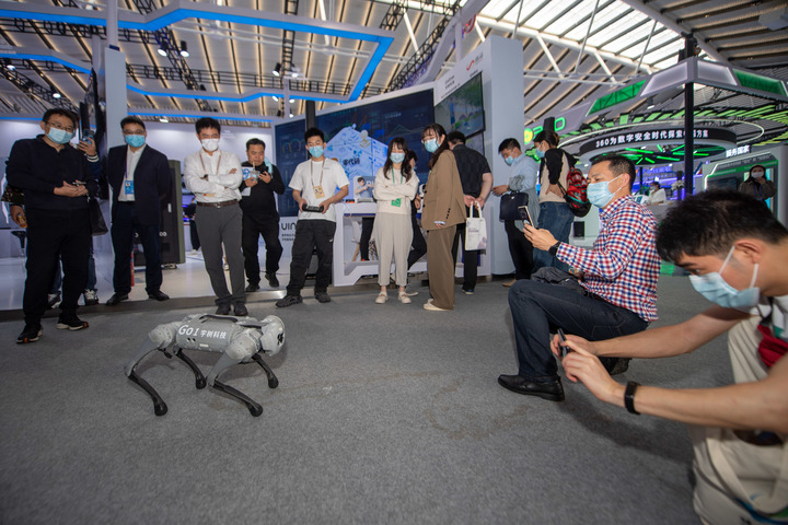11月10日,觀眾在博覽會上參觀機(jī)器狗表演?!⌒氯A社記者 江漢 攝