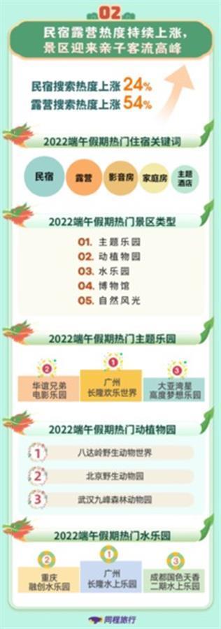 城市周邊游仍是端午假期旅游消費市場的主流。數據顯示,今年端午小長假期間,城市周邊的民宿和露營關注度持續(xù)升溫,民宿搜索熱度環(huán)比上漲24%,露營搜索熱度環(huán)比上漲54%。城市郊區(qū)的露營地和精品民宿推出了“住宿+體驗”型產品,將個性化的住宿與飛盤、露天電影等時尚玩法,或包粽子、做香包等傳統(tǒng)民宿相結合,給人們帶來更豐富的周邊出行體驗。除了民宿和露營外,影音房、家庭房、主題酒店也是人們假期關注的熱門住宿關鍵詞。
