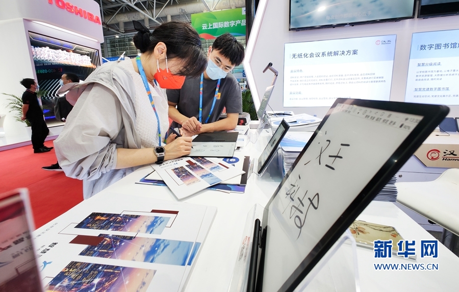 市民在展會(huì)現(xiàn)場(chǎng)體驗(yàn)一款基于墨水屏技術(shù)的電紙本。隨著國(guó)家“雙碳”戰(zhàn)略加速落地,具有省電節(jié)能、綠色低碳等特點(diǎn)的電紙本,在無紙化辦公賽道上,擁有巨大市場(chǎng)潛力。新華網(wǎng) 劉默涵 攝