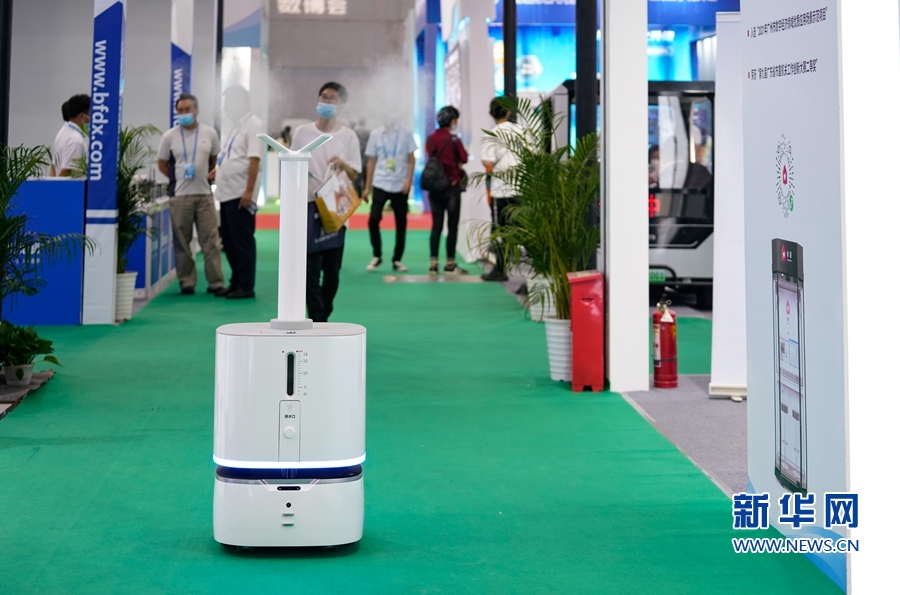數(shù)博會(huì)上展示的防疫消殺機(jī)器人,可在展館內(nèi)自動(dòng)避障消殺?!⌒氯A網(wǎng) 蔣巧玲 攝