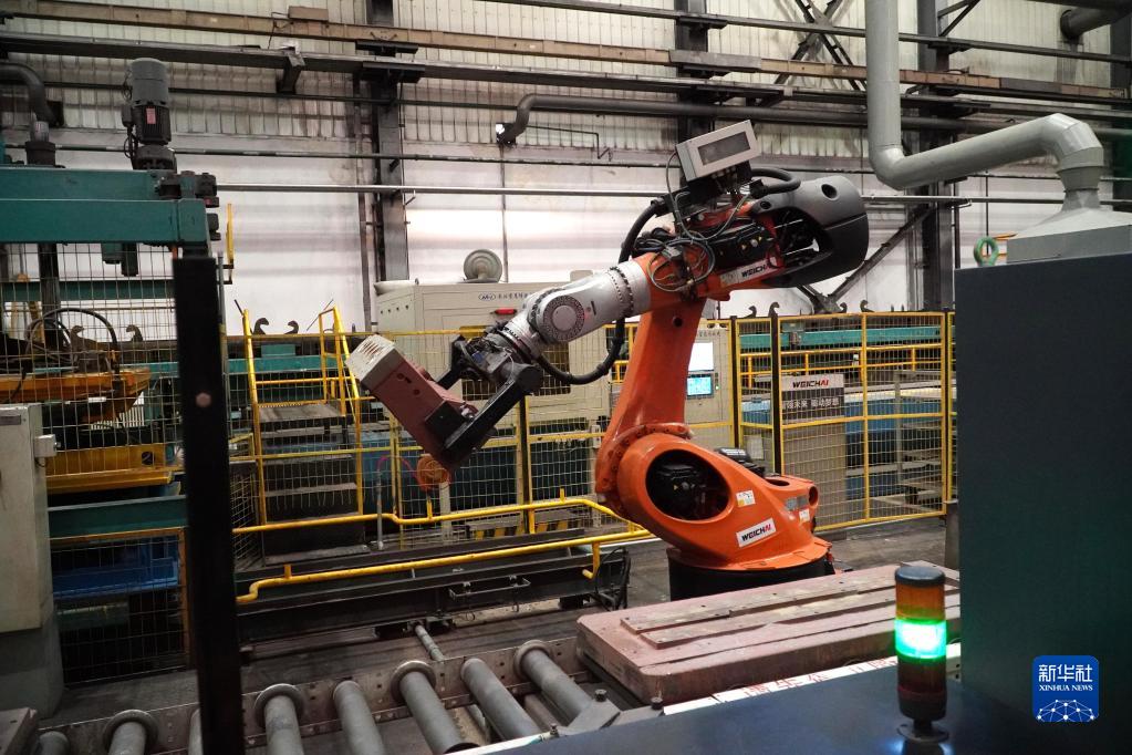 在位于山東省濰坊市的濰柴(濰坊)材料成型制造中心的生產(chǎn)車間,一臺(tái)機(jī)械手在工作(9月19日攝)。新華社記者 徐速繪 攝