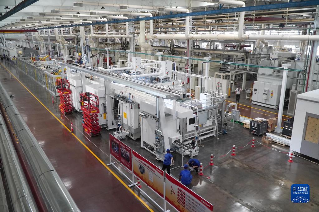 在山東省濰坊市,濰柴集團(tuán)的工作人員在一條新的生產(chǎn)線上安裝調(diào)試設(shè)備(9月19日攝)。新華社記者 徐速繪 攝