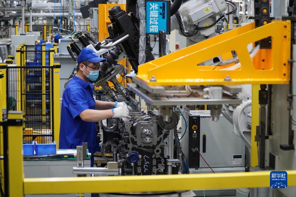 在山東省濰坊市,濰柴集團(tuán)的工作人員在發(fā)動(dòng)機(jī)生產(chǎn)線上工作(9月19日攝)。新華社記者 徐速繪 攝