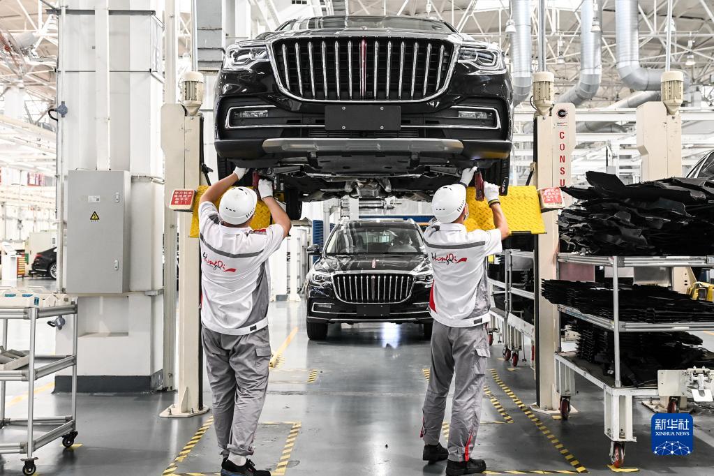 工人在位于吉林長(zhǎng)春的一汽紅旗工廠總裝車(chē)間內(nèi)裝配車(chē)輛(2021年7月1日攝)。新華社記者 顏麟蘊(yùn) 攝