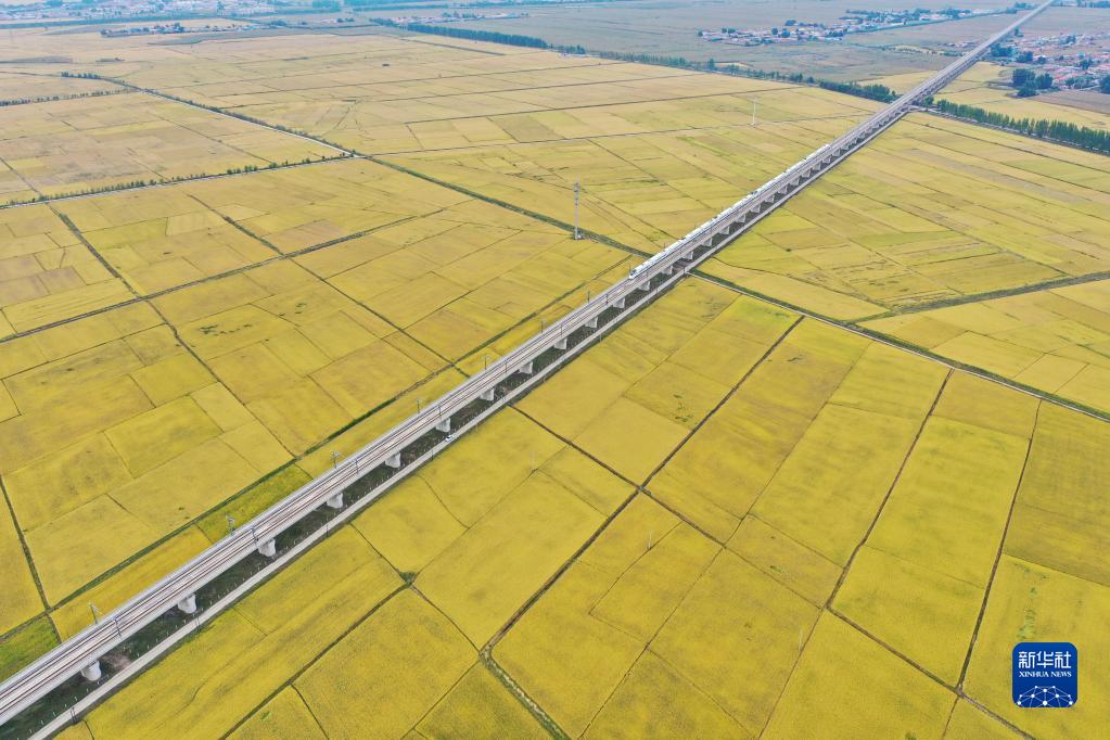 高鐵列車(chē)從吉林省公主嶺市沃野間駛過(guò)(2021年9月19日攝,無(wú)人機(jī)照片)。新華社記者 張楠 攝