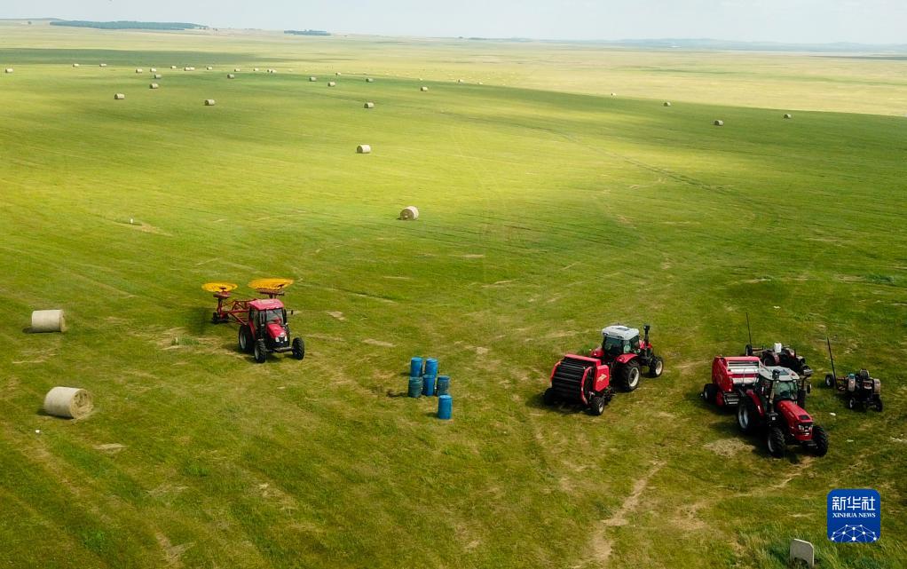 2022年7月25日,打草機(jī)在呼倫貝爾草原上打草(無人機(jī)照片)。新華社記者 彭源 攝