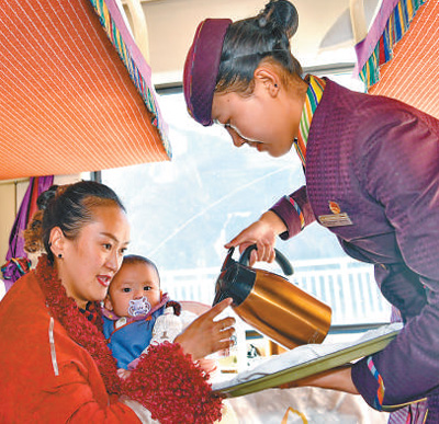 青藏鐵路延長線拉日鐵路Z8801次列車上,乘務(wù)員在為乘客倒水。