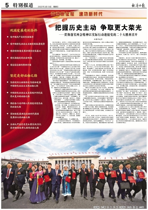 “有中國(guó)共產(chǎn)黨的堅(jiān)強(qiáng)領(lǐng)導(dǎo)”“有中國(guó)特色社會(huì)主義制度的顯著優(yōu)勢(shì)”“有持續(xù)快速發(fā)展積累的堅(jiān)實(shí)基礎(chǔ)”“有長(zhǎng)期穩(wěn)定的社會(huì)環(huán)境”“有自信自強(qiáng)的精神力量”,“五個(gè)有利條件”彰顯從戰(zhàn)略上認(rèn)識(shí)、分析、判斷時(shí)代大勢(shì)的智慧與定力。