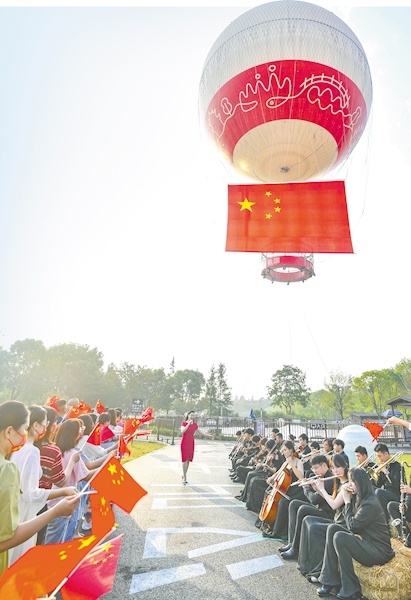 昨日,在武漢東湖,伴隨交響樂團奏響《我和我的祖國》,一面巨幅五星紅旗裝掛在氦氣球上冉冉升起,飄揚在73米高空。歡樂喜慶的場面吸引眾多游客停下腳步,他們揮舞著國旗同聲歌頌祖國,向空中的巨幅國旗行注目禮,主動加入到這場“向祖國表白”的行動中來。