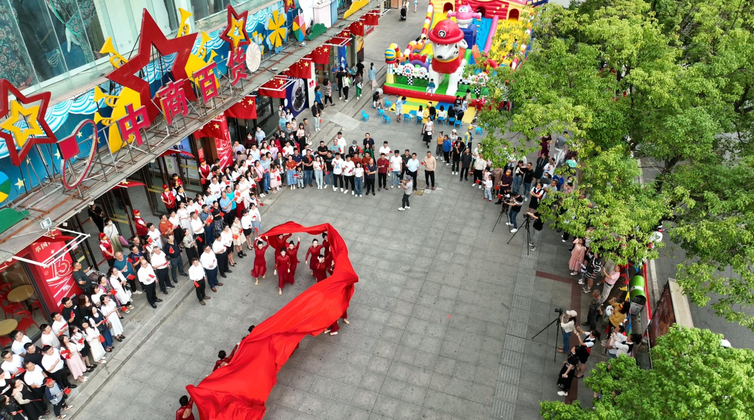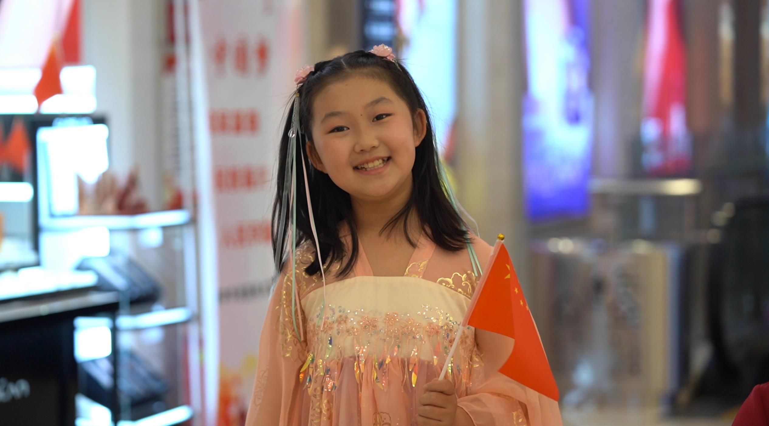 國慶快閃活動(dòng)在清澈的童聲獨(dú)唱中拉開序幕。身著中國傳統(tǒng)服飾,手拿紅旗的女孩從人群中走出,唱響對祖國的告白。隨后,越來越多的人加入到合唱中來,大家載歌載舞,數(shù)百名圍觀群眾和演員跟著旋律共同揮動(dòng)手中的國旗演唱,把活動(dòng)氣氛推向高潮。