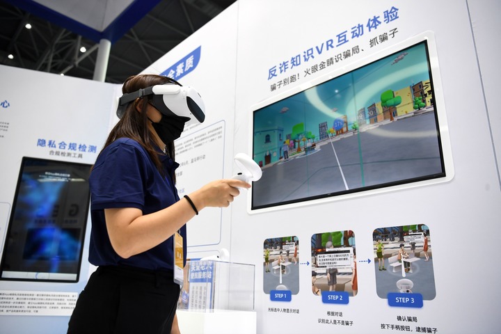 9月4日,一家參展企業(yè)代表在演示反詐知識VR互動體驗項目。新華社記者 劉軍喜 攝