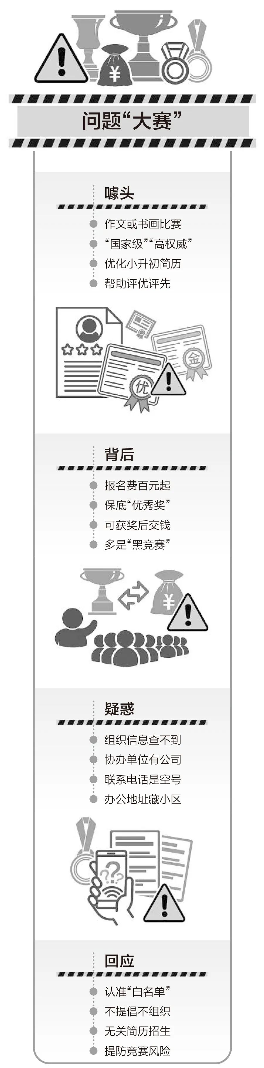 “違規(guī)競(jìng)賽!”近期,教育部回應(yīng)了群眾反映的“葉圣陶杯”華人青少年作文大賽,引發(fā)社會(huì)關(guān)注。記者調(diào)查發(fā)現(xiàn),如今以中小學(xué)生和家長(zhǎng)為目標(biāo)的各類違規(guī)競(jìng)賽依舊不少。不少“大賽”動(dòng)輒標(biāo)榜“國家級(jí)”,但“交錢就有獎(jiǎng)”,其背后問題重重。動(dòng)輒“國家級(jí)” 拿簡(jiǎn)歷說事“三大寫作賽事之一,‘為學(xué)杯’征稿中。”一家社交平臺(tái)上,有人發(fā)布這樣的比賽廣告,引得不少家長(zhǎng)跟帖咨詢?nèi)绾螀①?。廣告中,宣稱“為學(xué)杯”作文大賽和“葉圣陶杯”“冰心杯”齊名,屬于“國家級(jí)”寫作賽事。而當(dāng)詢問是否還能報(bào)名“葉圣陶杯”作文比賽時(shí),其表示已于2月16日截止了。這樣“高端”的作文比賽廣告,不是個(gè)例。還有中介整理出一份“2023年比賽清單”,其中更是包含了多個(gè)面向全國中小學(xué)生的各類作文、書畫比賽。而這些比賽,都被宣稱為“高權(quán)威、高含金量中小學(xué)比賽?!?/span>五花八門的比賽動(dòng)輒被宣傳形容為“國家級(jí)”“全國性”“高權(quán)威”等字眼,有的甚至直接在比賽中冠以“中國”之名,乍一看噱頭十足。在中國少兒藝術(shù)網(wǎng)上,第十三屆中國少兒書畫攝影大賽就正在進(jìn)行中。從征稿函來看,參賽主題不限、作品種類不限、作品尺寸和規(guī)格不限、每個(gè)學(xué)生投稿數(shù)量也不限,幾乎談不上有任何門檻。盡管大賽每年一屆,但每屆分春夏秋冬四個(gè)季賽,全年可隨時(shí)投稿。“大賽秉承激勵(lì)和賞識(shí)的教育理念,參賽作品獎(jiǎng)設(shè)置豐富?!豹?jiǎng)項(xiàng)設(shè)置一欄顯示,每1萬幅作品中設(shè)特別金獎(jiǎng)200名,金獎(jiǎng)1000名,銀獎(jiǎng)2500名,銅獎(jiǎng)4000名,其余為優(yōu)秀獎(jiǎng)。在評(píng)獎(jiǎng)方面同樣“慷慨”的還有第十四屆“飛翔中國”全國青少年兒童書畫攝影活動(dòng)。從征稿函來看,本屆獲獎(jiǎng)作品分設(shè)“小藝術(shù)家人才獎(jiǎng)”5‰,特等獎(jiǎng)1%、一等獎(jiǎng)25%、二等獎(jiǎng)30%、三等獎(jiǎng)30%、優(yōu)秀獎(jiǎng)若干。參加這些比賽,究竟有什么用呢?咨詢多位負(fù)責(zé)代報(bào)名的“老師”后,他們大多拿孩子的升學(xué)或“評(píng)優(yōu)評(píng)先”的簡(jiǎn)歷說事?!爸饕切∩鹾?jiǎn)歷優(yōu)化為主?!薄翱梢载S富簡(jiǎn)歷”。而也有人直接宣稱可以輔助評(píng)優(yōu)評(píng)先,“中小學(xué)生簡(jiǎn)歷豐富、評(píng)優(yōu)評(píng)先都需要有全國性的權(quán)威賽事證書支撐……照著清單準(zhǔn)備起來,杠杠地靠譜!”交錢就有獎(jiǎng) 涉嫌“黑競(jìng)賽”這些名目繁多的作文、書畫比賽,參賽難度如何,獲獎(jiǎng)希望大嗎?經(jīng)過調(diào)查,記者發(fā)現(xiàn)多個(gè)比賽的難度偏低。至少在宣傳環(huán)節(jié)上,幾乎都是變相“交錢拿獎(jiǎng)”。“小孩以鼓勵(lì)為主,你們集體的可以老師進(jìn)行初評(píng)?!庇浾咭耘嘤?xùn)機(jī)構(gòu)老師的身份咨詢是否交錢就能有獎(jiǎng)杯時(shí),第七屆“中國希望杯”全國青少年兒童書畫攝影大賽工作人員言辭閃爍,而征稿函在參加辦法中明確表示,每位參賽作者收取報(bào)名費(fèi)100元,組委會(huì)將頒發(fā)獲獎(jiǎng)證書,授予“新時(shí)代經(jīng)典小藝術(shù)家”榮譽(yù)勛章1枚,贈(zèng)送新款保溫杯1個(gè),并強(qiáng)調(diào)勛章的正面上方是國徽,下方是天安門和華表,背面刻有中國希望杯全國青少年書畫攝影大賽字樣,高檔錦盒包裝,極具收藏紀(jì)念價(jià)值。此外,征稿函還提到,凡交納185元的作者,贈(zèng)送榮譽(yù)獎(jiǎng)杯1個(gè),凡交納300元的作者,額外贈(zèng)送畫冊(cè)一本,并把獲獎(jiǎng)作品印在畫冊(cè)上。“參賽有保底”“最低優(yōu)秀獎(jiǎng)”,這是不少代報(bào)名老師口中的第十九屆“為學(xué)杯”中小學(xué)作文大賽。兩位不同機(jī)構(gòu)的代報(bào)名老師均表示,參與這項(xiàng)比賽,最低都能獲得優(yōu)秀獎(jiǎng),會(huì)有證書、作文書籍。至于參賽,一個(gè)報(bào)名老師表示直接進(jìn)入復(fù)審階段,其發(fā)來的一個(gè)團(tuán)購鏈接顯示,“復(fù)審需繳納100元費(fèi)用作為資料費(fèi)”,已有153人團(tuán)購報(bào)名;而如果晉級(jí)全國決選,參賽費(fèi)用則為560元。第十四屆“飛翔中國”全國青少年兒童書畫攝影活動(dòng)則規(guī)定,獲獎(jiǎng)小作者可預(yù)訂“水晶獎(jiǎng)杯”,定價(jià)為130元;“精美飛翔獎(jiǎng)杯”,定價(jià)為180元;“木質(zhì)獲獎(jiǎng)牌匾”,定價(jià)為140元。“可以參賽時(shí)候交,也可以獲獎(jiǎng)后再交?!苯M委會(huì)工作人員稱,參賽學(xué)生都能獲獎(jiǎng),根據(jù)作品來評(píng)定等級(jí)。培訓(xùn)機(jī)構(gòu)的老師可以在學(xué)生參賽時(shí)給出初評(píng)意見,組委會(huì)評(píng)委會(huì)參考。今年1月31日,教育部在官網(wǎng)發(fā)布了《關(guān)于共同抵制面向中小學(xué)生違規(guī)競(jìng)賽活動(dòng)的提醒》。其中談到,凡未列入教育部公布的《2022—2025學(xué)年面向中小學(xué)生的全國性競(jìng)賽活動(dòng)名單》的,均屬違規(guī)舉辦的“黑競(jìng)賽”。記者查詢以上多個(gè)賽事發(fā)現(xiàn),均未入列此名單。也就