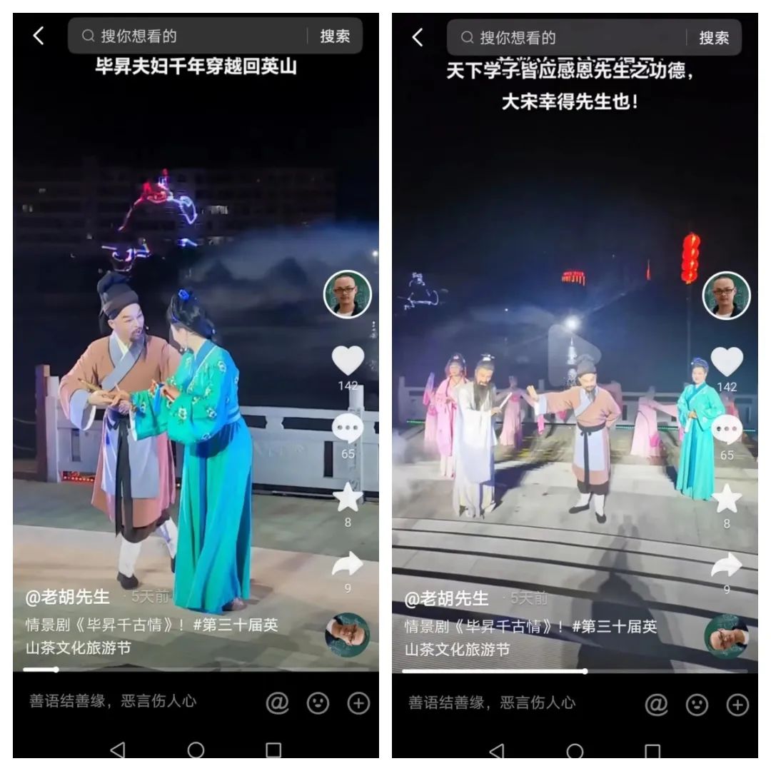 河道中間的水幕燈光秀和情景劇表演是此次活動的重頭戲。情景劇中,1000多年前的畢昇和夫人李妙音穿越時空來到英山游船,偶遇800多年前的蘇東坡和王朝云,兩對不同時空的名人在英山邂逅,經(jīng)過一段充滿詩情畫意的詩詞歌舞表演后,共同坐下品茶。整場活動充分利用現(xiàn)代化的聲光電技術(shù),將歷史和現(xiàn)代完美融合,碰撞出獨屬英山的浪漫。