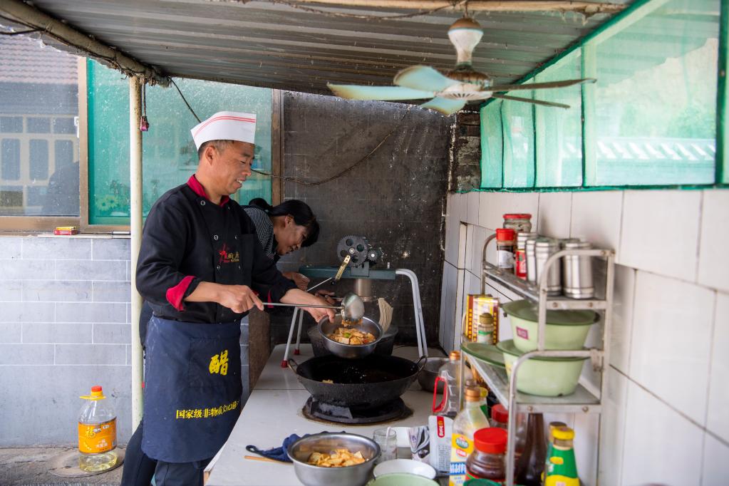 5月18日,在山西省長(zhǎng)治市武鄉(xiāng)縣磚壁村,村民張國(guó)兵(左)在自家的農(nóng)家樂里為客人準(zhǔn)備飯菜。新華社記者楊晨光攝