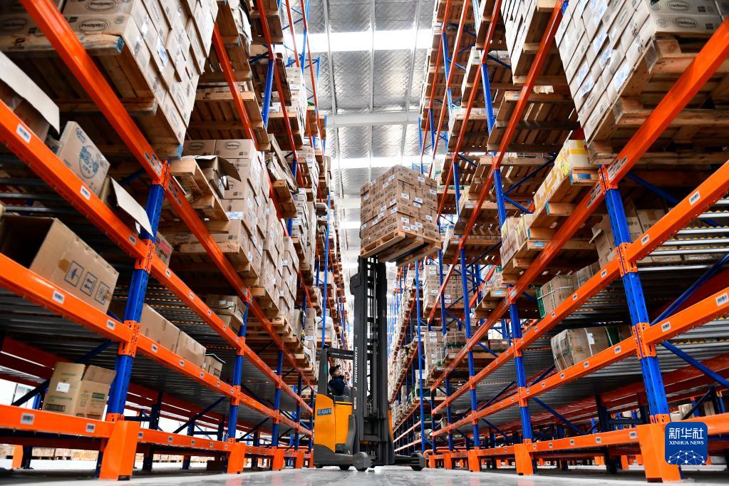 在臨沂商谷羅濱遜智慧物流園1號(hào)云倉,工作人員在貨架上取貨物(2020年11月21日攝)。新華社記者 郭緒雷 攝