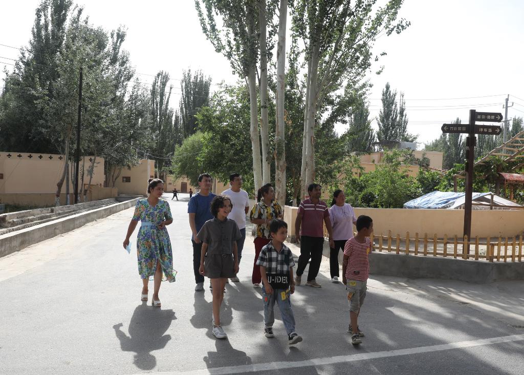 一群游客在新疆和田縣稻香村散步游覽。